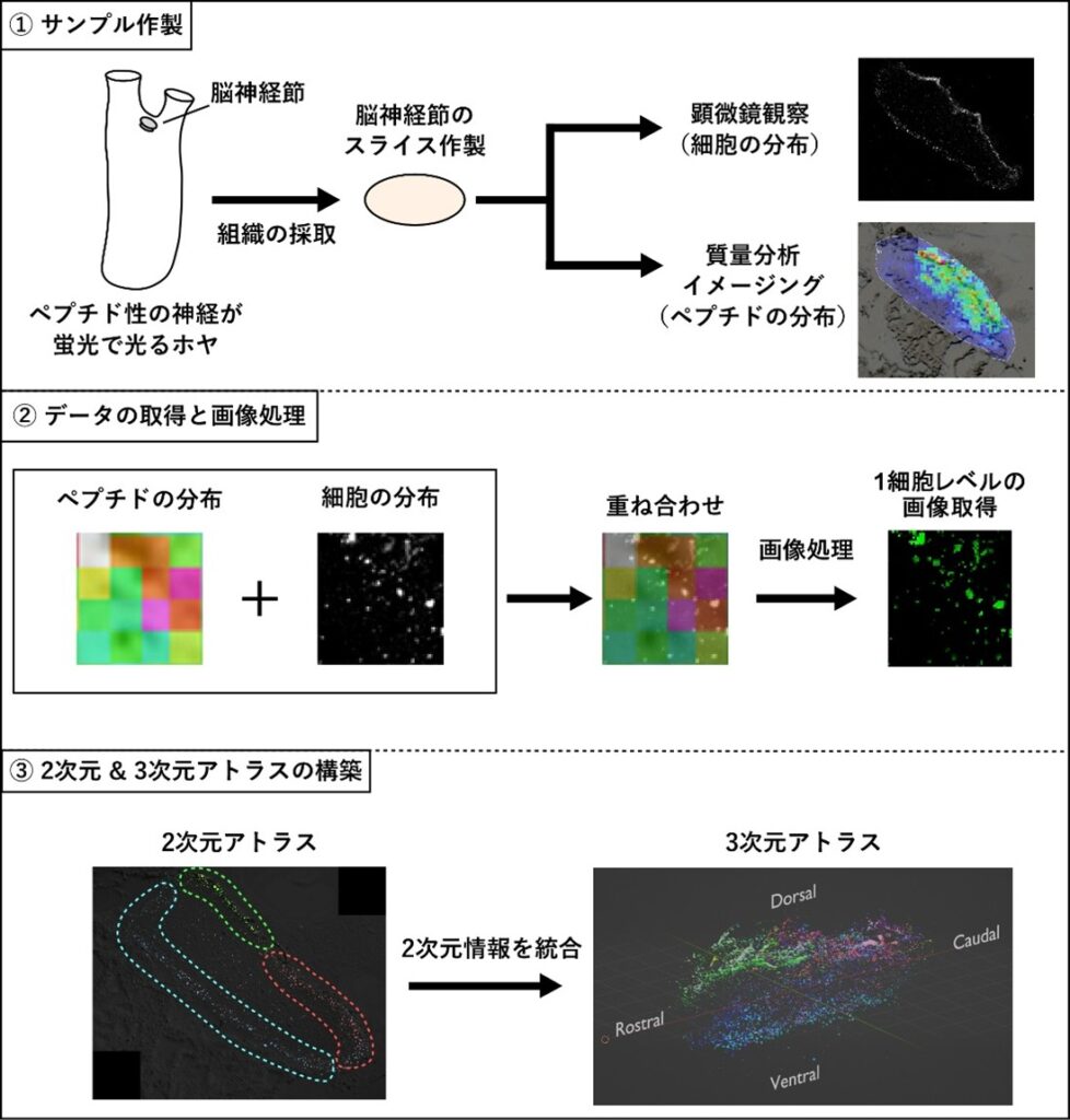 ホヤの脳にあたる脳神経節の構造を明らかにするため、私たちはこれまで研究してきた「ペプチドという物質を使う神経に光る目印をつけたホヤ」に注目し、その視点から脳の構造を調べることを考えました。まず、脳神経節をとても薄く切り出し、蛍光顕微鏡で神経細胞の分布を観察しました。次に、その同じ切片に対して質量分析イメージングという方法を使い、約20種類の神経ペプチドがどこに分布しているかを調べました。さらに、顕微鏡で得られた細胞の画像と、質量分析イメージングで得られたペプチドの分布画像を、画像処理の工夫によって重ね合わせることで、「どの細胞にどのペプチドがあるのか」を一枚の画像として示す新しい方法を確立しました。こうして、脳神経節全体をおよそ20枚の切片に分け、その全てで神経ペプチドの分布を細胞レベルで可視化することに成功し、ホヤの脳における2次元および3次元の「脳地図(アトラス)」を作り上げました。