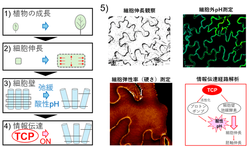 本研究は、TCP転写因子が細胞外pH酸性化を引き金に細胞壁を緩めて細胞伸長する仕組みの妥当性を植物生体内で示しました。将来は植物の草丈や形を調節するための基礎知識として、栽培や品種改良に貢献することが期待されます。
