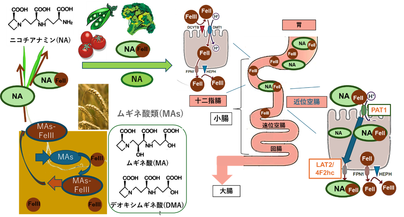 私たちの研究によって、従来考えられてきた十二指腸での鉄吸収とは異なる経路が存在することが明らかになりました。この経路では、近位空腸にある「PAT1」と呼ばれるアミノ酸トランスポーターを介してNA-鉄錯体が吸収されることを解明することができ、2021年に報告しました。(J Biol Chem. 2021,296:100195. doi: 10.1074/jbc.RA120.015861. 著書「Iron in Biology」The Royal Society of Chemistry 2025, p177-194 Chapter 12: Iron-phytosiderophore and the Mechanism of its Uptake from Soil)